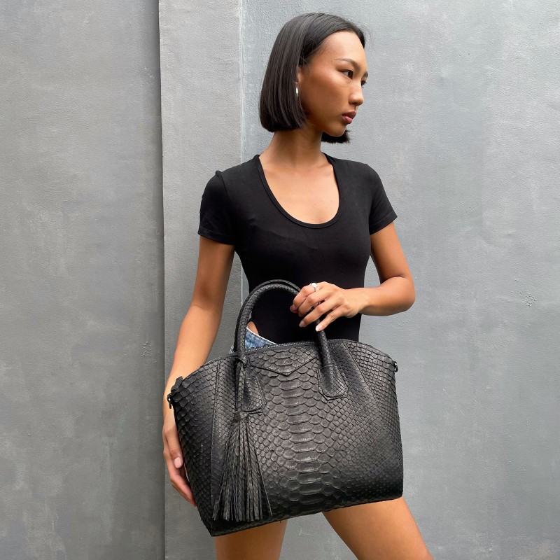 Material: Python Skin/ Black Color Size: 32/42x19x25Cm Accessories : Black Nickel Long strap : Yes