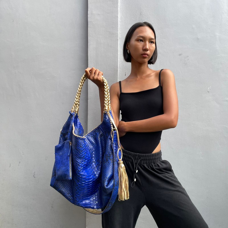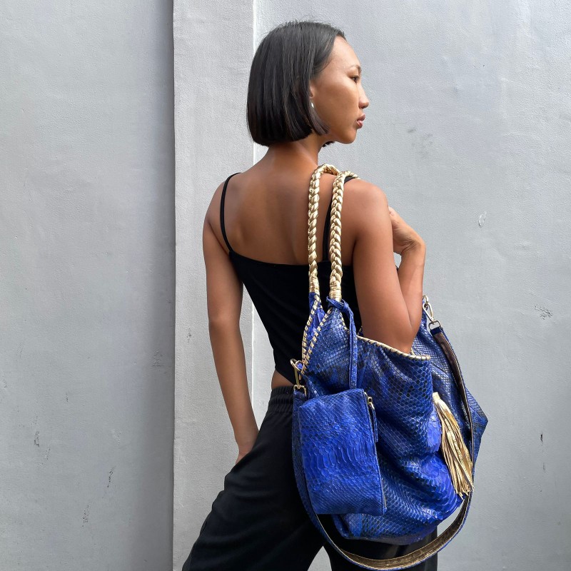 Material: python Size: 50X15X35CM Accessories: gold Long strap: Yes Extra pouch