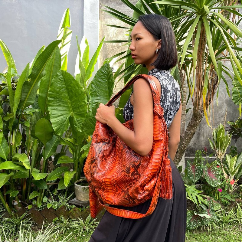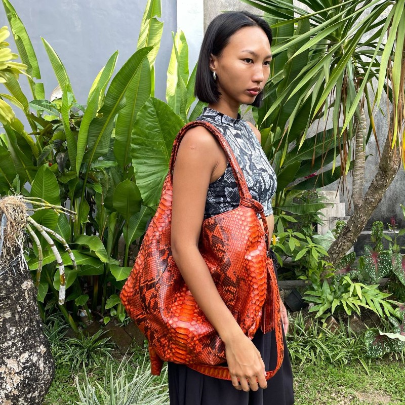 Material: python/ glossy Size: 50X12X35CM Accessories: Black Nickel Long strap: Yes Extra pouch