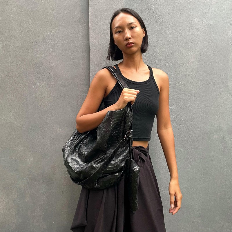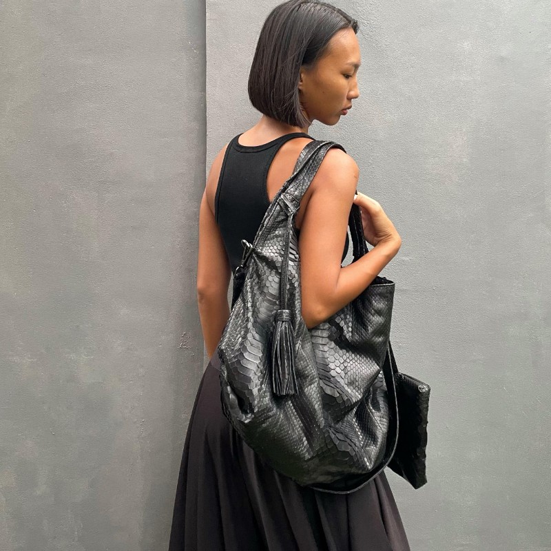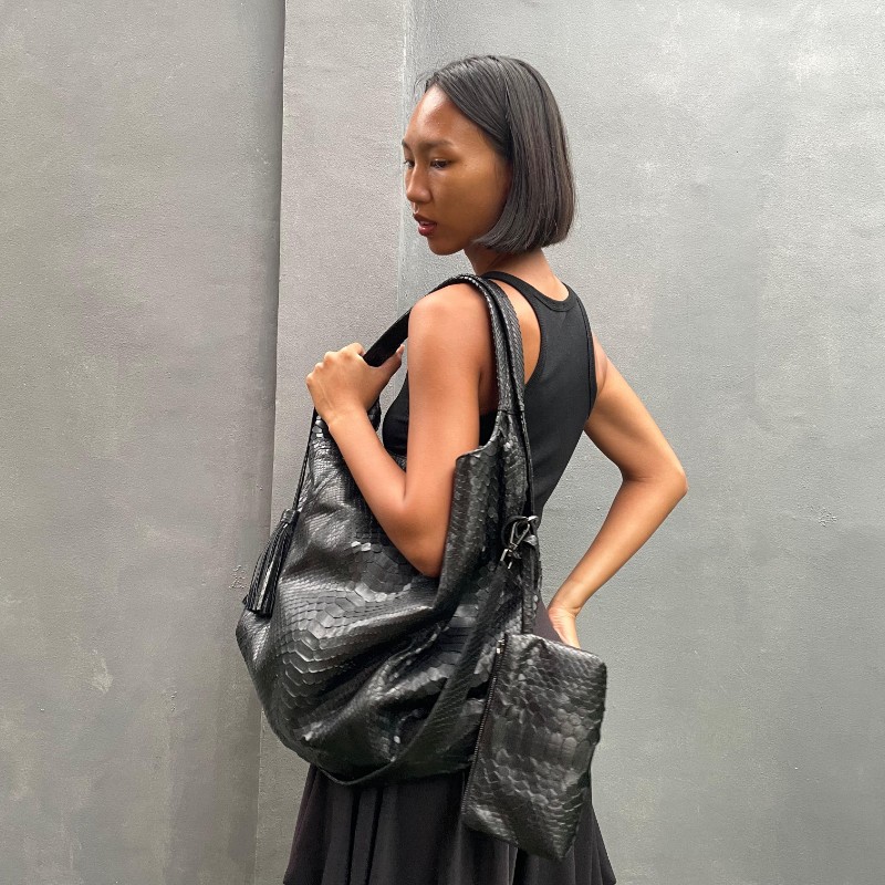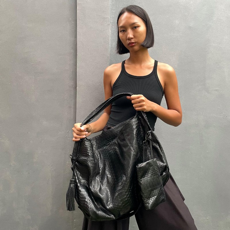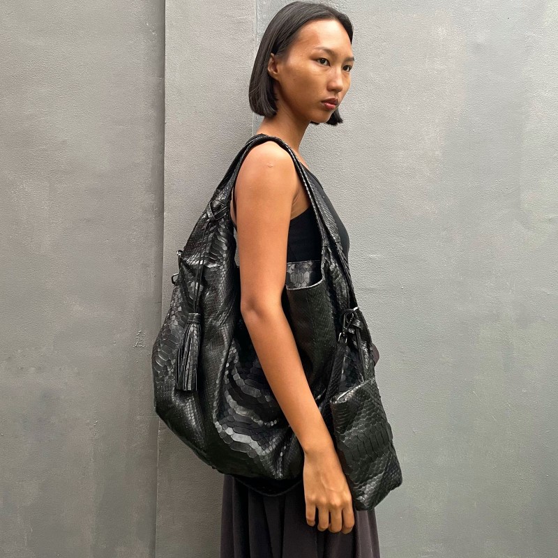 Material: python/ glossy Size: 50X12X35CM Accessories: Black Nickel Long strap: Yes Extra pouch