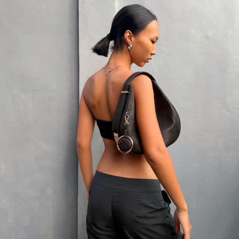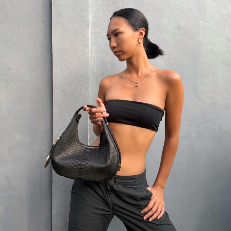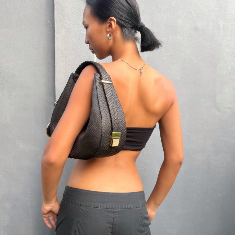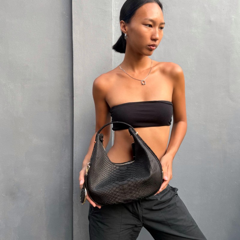 Material: Python/ Nobuck Size: 27X10x18cm Accessories: Gold Zipper Closure