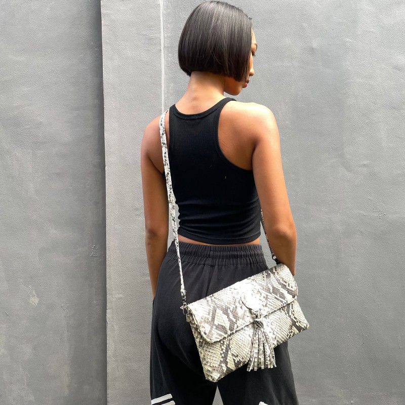 Material: Python Size: 30x18cm Magnetic Closure Accessories: Black Nickel Detachable leather strap